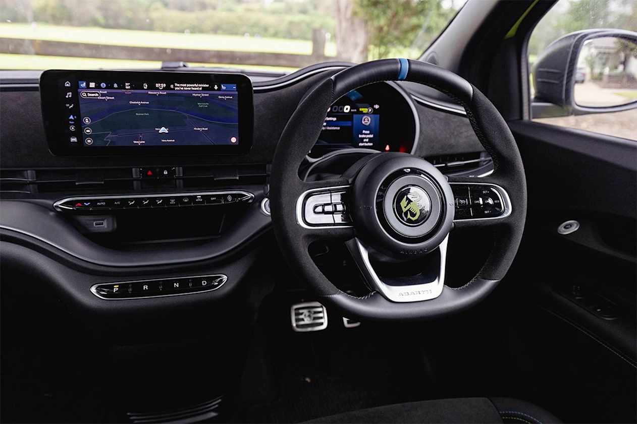 The 2024 Abarth 500e is fitted with a 42kWh battery that delivers a claimed 253km of driving range. It’s worth noting that there are three Drive Modes — Turismo, Scorpion Street and Scorpion Track — and that only the first one will deliver the maximum range, because it limits inputs to 100kW and 220Nm. Engage the other two and you can expect those numbers to drop.