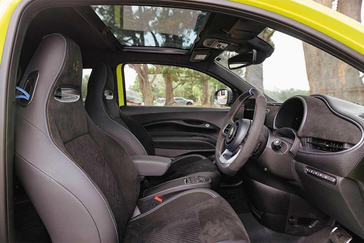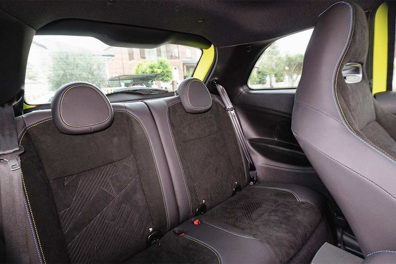 Outside, either trim gets 18-inch diamond-cut alloys, LED lighting all around, a fixed glass roof, the new e-latch front doors (meaning you can just push a button to open the door) from the 500e, along with some performance-focused add-ons, like a front splitter, greyed-out mirror caps, rear disc brakes and new front and rear bumper treatments.
