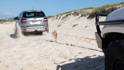 Your mate’s bogged on the beach and everything you’ve tried to get him out – digging, dropping tyre pressures, using vehicle-recovery tracks – has not succeeded. So, now you’re going to do a snatch-strap recovery of his vehicle – safely, sensibly and with no damage to people or vehicles.Before you even get anywhere near driving on a beach you should do a 4WD driver course with a nationally recognised four-wheel-driving instructor. Get one of these courses under your belt and that will go a long way to making sure you’re able to drive your vehicle safely and confidently in off-road situations; it'll also teach you the necessary skills so you're able to execute a vehicle-recovery with minimum fuss.How badly bogged is the vehicle? Are all four wheels spinning uselessly? Is the underbody snagged on a half-buried tree stump, branch or rock?Clear away all obstacles from under and around the stuck vehicle, make sure it has a cleared path out – preferably in a straight line forward or to the rear of the stuck vehicle depending on which is the easiest recovery route* – and formulate a plan of action. (*In our accompanying photo sequence, we’re recovering from the front.)Before we go any further it’s pertinent at this point to give a snapshot explanation of what a snatch strap vehicle-recovery is; don't worry, we give you a comprehensive step-by-step guide further down this page.A snatch strap is basically a length of elasticated nylon webbing bound together to form a rope which, when used properly in a vehicle-recovery, is attached to rated recovery points via rated bow shackles on a rescue vehicle and a stricken vehicle. When the rescue vehicle pulls away, the strap stretches taut, absorbs the kinetic energy involved and uses that energy to ‘snatch’ the stuck vehicle out of strife.The Office of Fair Trading states that “the recommended minimum breaking strength of the strap is twice the gross vehicle mass (GVM) of the lighter of the two vehicles”. Before you use it, make sure the strap is not damaged; never use your snatch strap for towing or lifting.In the accompanying photos, we’re using a strap and bow shackles from an ARB RK9 Recovery Kit. A strap should be rated 8000kg, as a minimum, but they can be rated up to 15,000kg. Shackles should be rated, as a minimum, for a 3.5-tonne working load; the working load limit figure should be clearly visible on the shackle itself.Do not use any vehicle’s tow ball as a recovery points – some people have done that in the past with absolutely disastrous results. Why? Because the tow ball may snap off under the extreme forces at work and then it becomes a projectile, potentially lethal.Do not use your vehicle’s shipping tie-down points as recovery points – these were designed to secure it in position on a vehicle-transport vessel or truck and they are simply not strong enough to cope with the stresses involved in a vehicle-recovery.Use a rated recovery point on your vehicle; you can use your tow-hitch receiver as we’ve done in the photos.Attach your snatch strap to the vehicle in strife first. Unscrew the pin from your rated bow shackle (part of the recovery kit you brought along with you), feed the shackle through one eyelet of the strap until the eyelet rests on the inside of the shackle’s bow. At the other end of the shackle, put the pin back in so it goes through the pin holes and the recovery point, then screw it in securely.Lay the snatch strap in a loose ’S’ shape on the sand in front of the stuck vehicle, then back the rescue vehicle up so there are a few metres of slack in the strap. Attach the other end of the snatch strap to the rescue vehicle. Use the same process as we did to attach the other end of the strap to the stranded vehicle, however, as mentioned, we used the Everest’s tow-hitch receiver, so we did not use a bow shackle; check out the photos for a better idea of the set-up. Make sure the strap has no kinks or twists in it as those will impede its efficacy come recovery time. Put your recovery kit’s strap damper – it’s like a small weighted vest – over the middle of the strap as that will help to take the power out of it if something does snap during the recovery. If you don’t have a damper, use a heavy blanket or something similar.Move everyone not directly involved in the recovery away from the recovery site; they should be at a distance of at least one and a half times the length of the unstretched strap away.Make sure the drivers of both vehicles have clear communications, via UHF or handhelds during the recovery. If possible, also have someone – standing at a safe distance away but able to be seen by both drivers – oversee the recovery and use agreed-upon hand signals to communicate with the drivers.The driver of the stuck vehicle should now be set to go, in low-range first gear, engine running. Seatbelt on, clear route straight ahead in mind.The driver of the rescue vehicle should be also ready to go, in low-range second gear, engine running. Seatbelt on, clear route straight ahead in mind.After both drivers confirm “Ready” over the radio – and perhaps even give a visual thumbs-up to make sure everyone knows the recovery is about to commence – the rescue vehicle driver will say an agreed countdown over the radio (such as “3,2,1 – go!”) and at “Go” that driver will accelerate; delivering firm and controlled momentum, not using foot-to-the-floor throttle. The snatch strap will stretch taut and then rebound, snatching the stricken vehicle out of its bogging.The driver of the stranded vehicle need only try to match the rescue vehicle’s momentum in a straight line as he or she feels the strap pull their vehicle forward.Once both vehicles are clear of the soft sand, pull up and disconnect the shackles and strap. Make sure none of the gear is dirty or damaged and put it all away properly in your recovery kit: clear sand off the strap and roll it up so it h