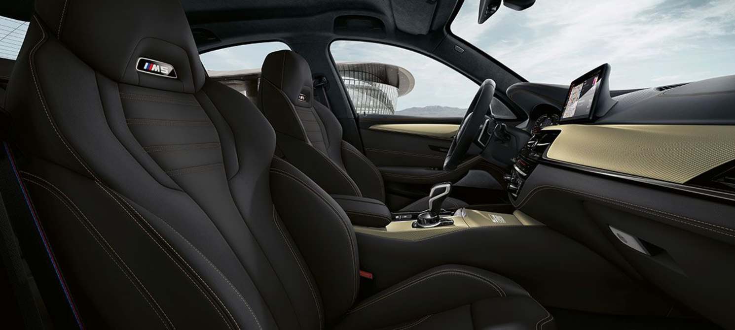 The following BMW M5 is available with five seats. The M5 Competition variant comes with Full Leather ‘Merino’ upholstery as standard, with the choice between Black, Silverstone/Black two tone or Aragon Brown/Black two tone. BMW Individual Full Leather ‘Merino’ upholstery is available as a no cost option, with the choice between Caramel, Smoke White or Tartufo.