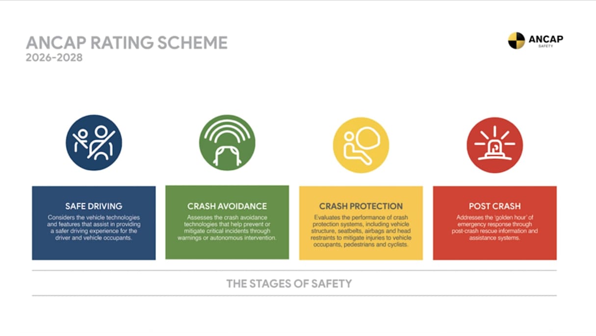 From January 2026, the new categories are designed to follow what ANCAP calls the ‘Stages of Safety’. These include Safe Driving, Crash Avoidance, Crash Protection and Post Crash.
