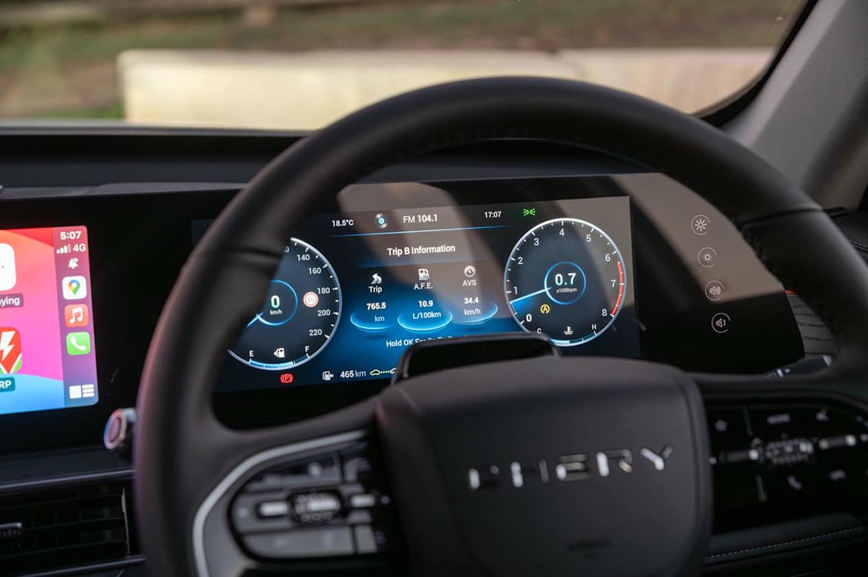 The Tiggo 8 Pro Max has a 57-litre fuel tank, indicating an estimated maximum cruising range of 703km for FWD variants.