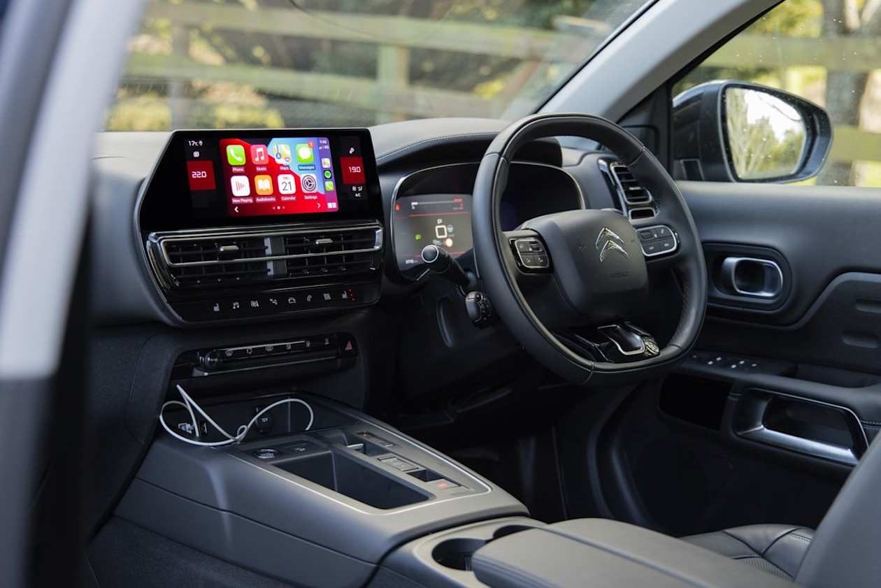 Standard equipment in the Aircross Sport includes: push-button start, 19-inch black alloy wheels, temporary spare tyre, leather steering wheel, steering wheel mounted controls, tilt and telescopic steering wheel, wired Apple CarPlay, wired Android Auto, Bluetooth, 10.0-inch touchscreen multimedia system, satellite navigation, 12.3-inch digital instrument panel, digital radio, three USB-A ports, a 12-volt socket, a wireless charging pad, two cupholders, LED exterior lights, an auto-dimming rear view mirror, and dual-zone climate control.