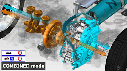 The latest setup combines a gasoline engine with a compressed air storage unit, a hydraulic motor and an automatic transmission with an epicyclic design. An intelligent electronic management system manages input from the driver to optimize energy efficiency with three operating modes: Air Mode, Gasoline Mode, and Combined Mode.