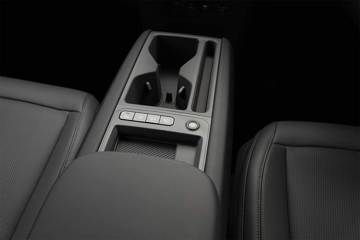 There are ISOFIX attachment points in the middle row window seats, cupholders in a pull-down divider, and storage cubbies galore.