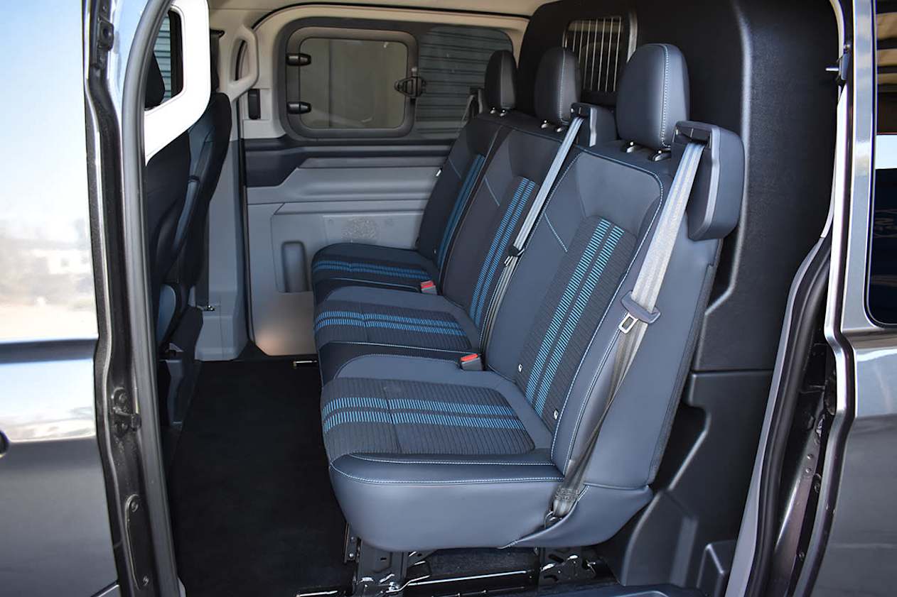 The Transit Custom SWB/LWB Trend and SWB Sport model grades provide seating for up to three occupants comprising a driver's bucket seat and two-passenger bench seat. Seating expands to five in the LWB Sport Double Cab, with bucket seats for the driver and front passenger and a three-passenger rear bench seat.