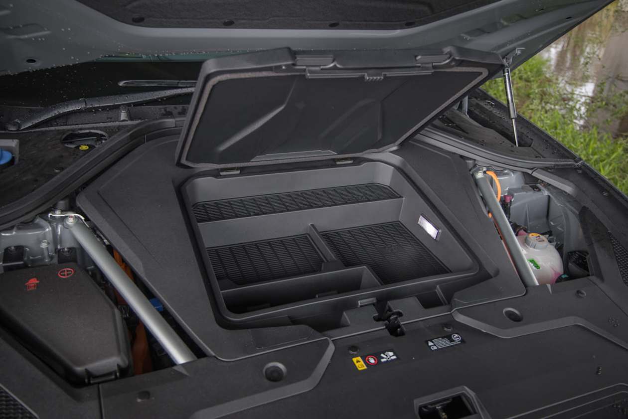 Standard accessories include keyless entry (all doors), keyless start, dusk-sensing Matrix LED headlights, DRLs, rain-sensing wipers, leather upholstery, powered front seats with heat/ventilation/memory functions, UV-C sanitiser, wireless charging pad, four USB-C ports, two 12-volt sockets, 250-volt domestic plug port (EV model only), tyre repair kit, warning triangle, first aid kit, tri-zone climate control, four 'soundscapes', multi-terrain drive modes, ambient lighting, 27-inch OLED display, wireless phone mirroring, satellite navigation, Bluetooth, AM/FM and digital radio, nine-speaker sound system, digital rearview mirror and a powered tailgate.
