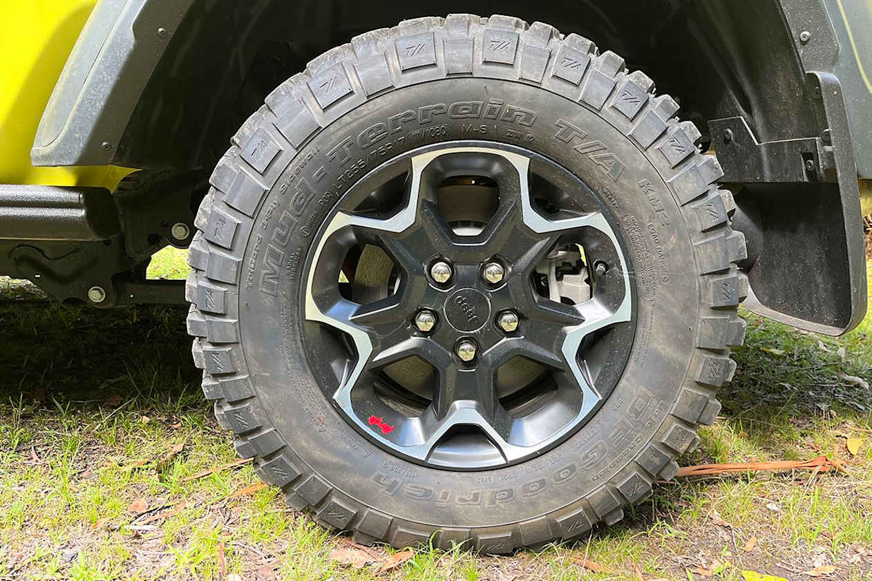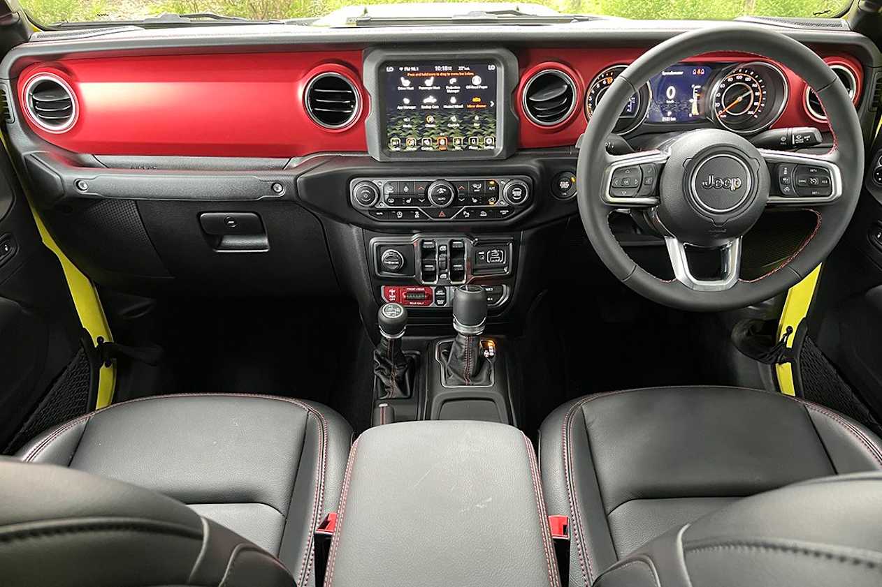 The high-spec Rubicon adds Jeep’s 'Rock-Trac Active On-Demand II' 4x4 system (4:1 transfer case), 'Tru-Lok' front and rear locking differentials, sway-bar disconnect, Tenneco 2.0-inch diameter aluminium-bodied shocks (front and rear; Fox shocks on previous versions), a 'TrailCam' off-road camera, selectable tyre-fill alert, BFGoodrich Mud Terrain Tyres (255/75 R17), and 17-inch machined-black alloy wheels.