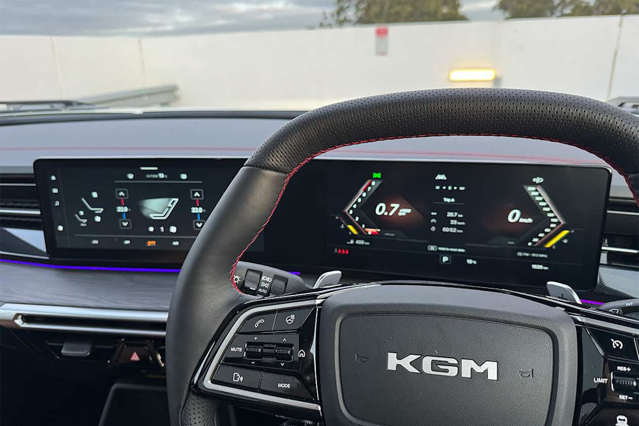 The dash is dominated by twin 12.3-inch displays that make up the digital instrumentation and centre multimedia touchscreen. While no buttons are present, KGM has introduced shortcuts to key functions to aid operation and minimise distraction. It’s all pretty intuitive. Additionally, the Actyon scores points for its effective climate control, endless storage areas, useful twin USB-C ports, ambient interior lighting and solid build quality.