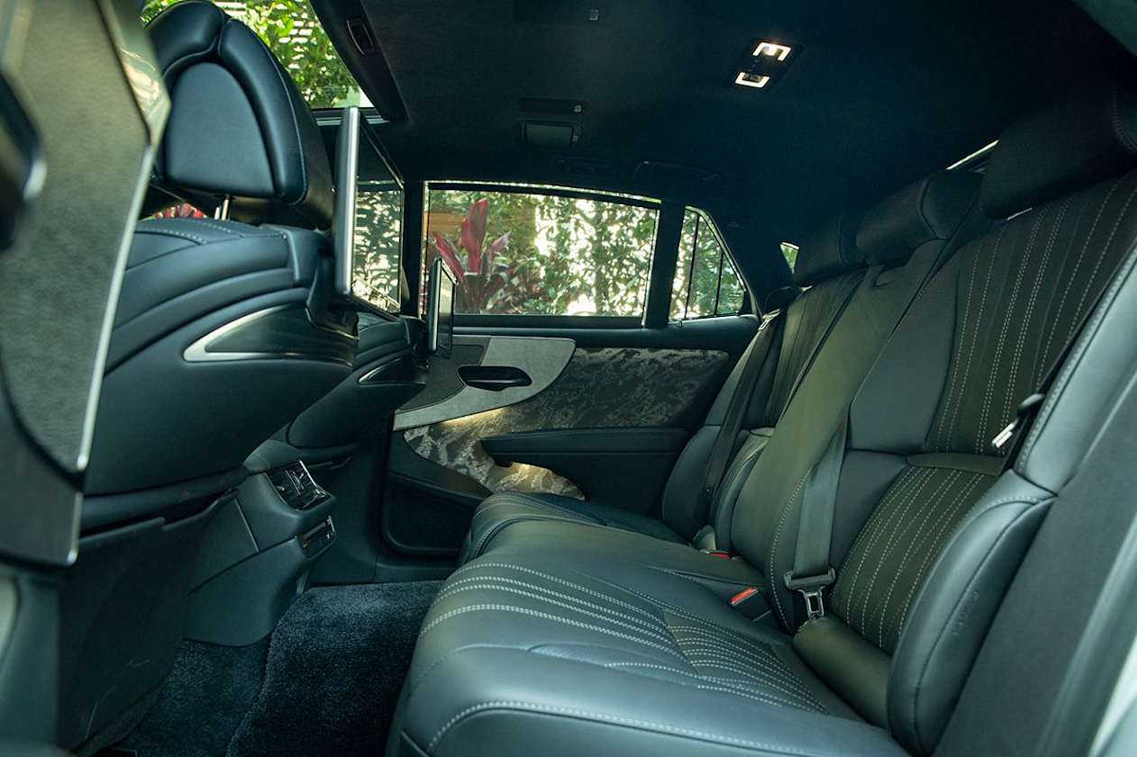 The LS has an opulent interior treatment as standard, with a mixture of true and synthetic soft-touch leather surfaces, a choice of door ornamentations, ambient interior lighting, as well as a large multimedia screen for the driver and dual 11.6-inch screens for each outboard rear passenger.