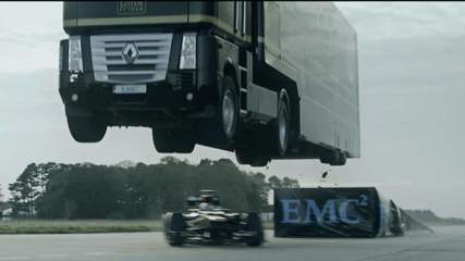 Watch the Lotus F1 team's semi-trailer jump over one of their F1 cars to set a new world record.An oft-quoted factoid in motorsport circles is that a Formula One racer can drive upside down in a tunnel.A never-quoted factoid is that you can jump a Formula One transporter over a Formula One racer.Enter stuntmen Mike Ryan and Martin Ivanov who went out and did just that, and set a world record in the process.Martin - whose credentials as a stuntman include work on the James Bond movies - slides the Lotus F1 racer underneath the team's semi-trailer.The truck - with The Fast and the Furious alumni Mike behind the wheel - sails majestically through the air before landing a world record-setting 83 feet 7 inches away from where it took off.Whether or not you can drive a Formula One transporter on the roof of a tunnel remains to be seen.