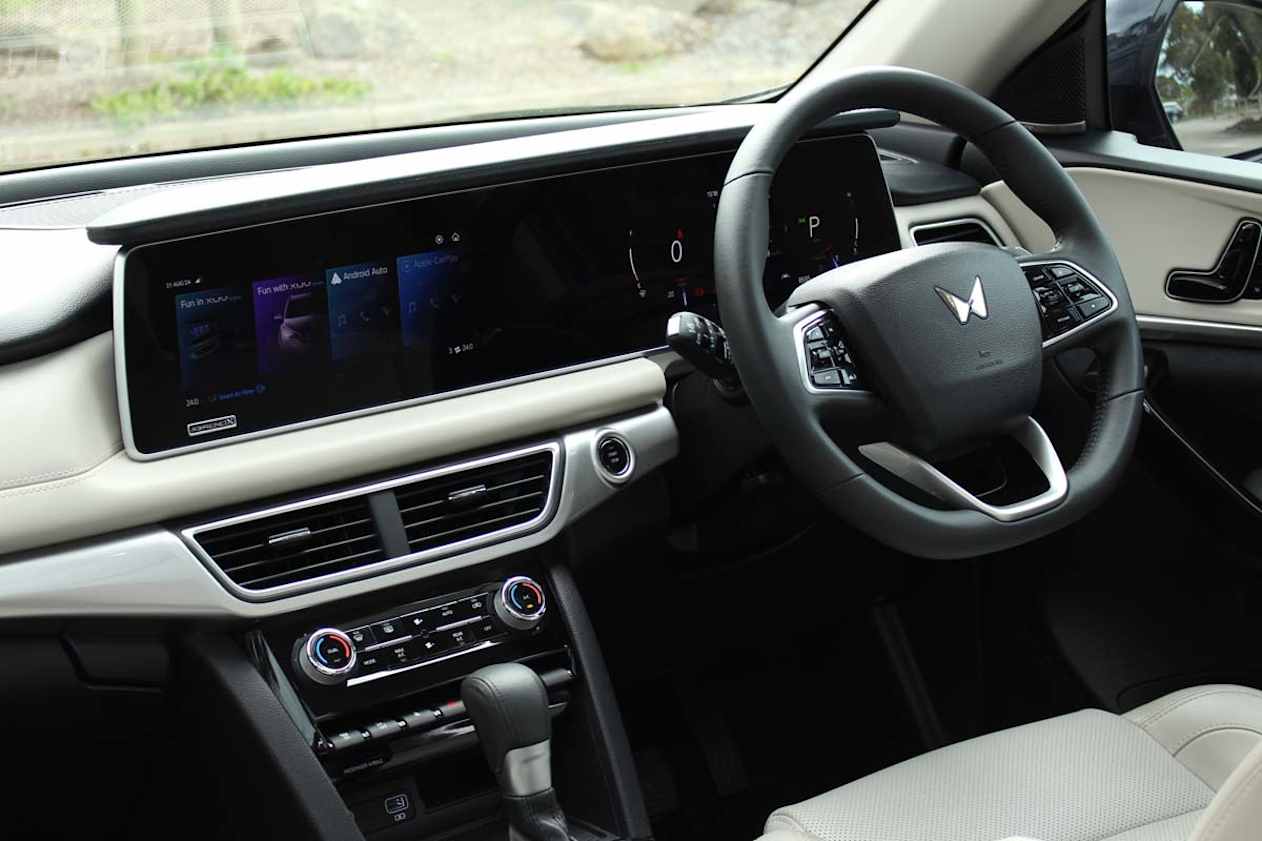 The XUV700 has a pair of 10.25-inch screens, one a multimedia touchscreen and one a driver display, plus a sunroof, wireless phone charging pad (but wired phone mirroring), six speakers for its Sony sound system, LED headlights and taillights, cornering lights and 18-inch alloy wheels.