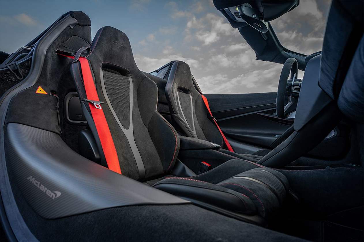 The McLaren 750S is a strict two-seater, accessible by ducking under the skyward-opening scissor doors before sinking into the cabin.