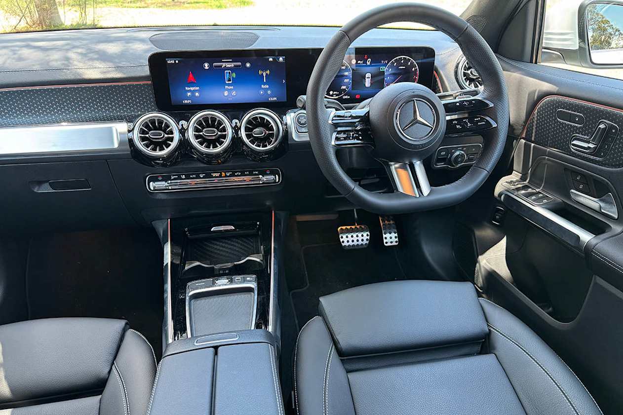 The Mercedes-Benz GLB's interior is dominated by the dual 10.25-inch screens for the digital instrument cluster and touchscreen multimedia system.