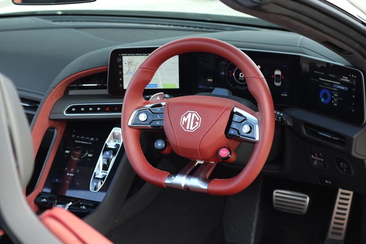 The MG Cyberster has a claimed 443km WLTP driving range thank to a 77kWh battery and a claimed power consumption of 19.1kWh/100km.