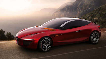 Billed as a “sport sedan with decisive lines,” the Gloria would be powered by a V-6 or biturbo V-8 engine. Its hood carries the shape of the traditional Alfa Romeo shield grille, while the leather straps flowing from the front fenders are meant to evoke the memory of historic Alfas past.