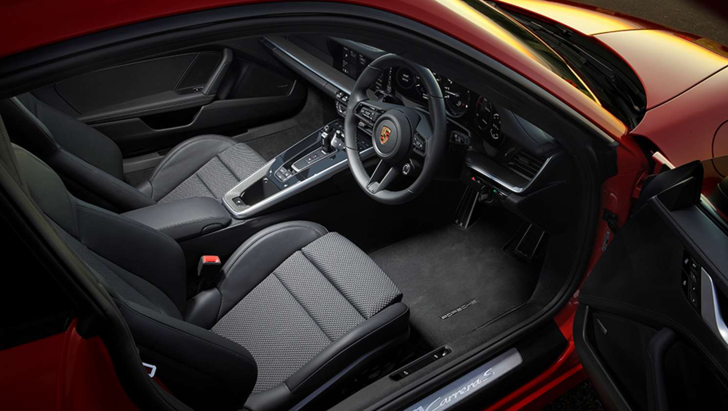 The following Porsche 911 is available with four seats, except for the Speedster and GT3 RS variants, which only have room for two. The Carrera, Carrera 4, Carrera S and Carrera 4S variants are all available with standard Fabric upholstery interior in either Black or Slate Grey, with leather front seats also available as standard. Black/Mojave Beige two tone standard interior is available as an optional extra. An optional leather package is available with the choice of either Black, Slate Grey, Graphite Blue, Bordeaux Red, Slate Grey/Crayon two tone, Black/Island Green two tone, Black/Bordeaux Red two tone or Black/Mojave Beige seat trim. Leather and Sport-Tex seats are available as an optional extra with the choice of either Black or Black with Crayon stitching. Club leather seat trim is also available as an optional extra, with the choice either of Truffle Brown or Agave Green. The Carrera T variant is available with Fabric upholstery as standard, with the choice of Black or Black with a contrast colour being either Guards Red, Racing Yellow or GT Silver. Leather upholstery is available with the same colour options as an optional extra. The Speedster variant comes with Black leather seats as standard, with Black/Cognac two tone or Black with Red contrast stitching available as an optional extra.