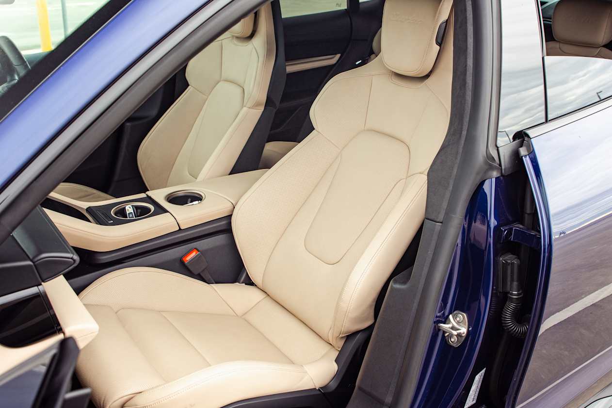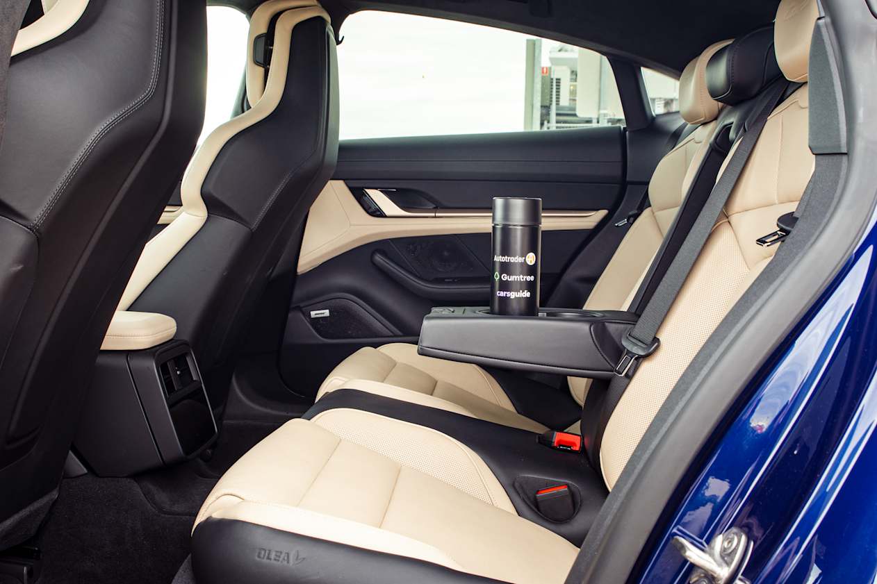 The Taycan has five seats, but is pitched as a '4+1' as the centre rear seat is very small. The front seats and outboard rear passenger seats are bucket-style, and all are clad in leather trim. Front seats are electrically adjustable and can optionally be heated.