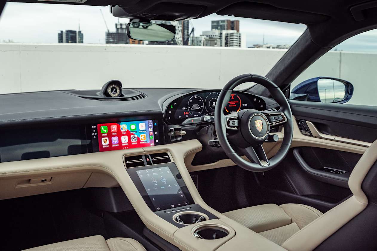 The Taycan's options list is up to 125 items long depending on the grade chosen, though standard fitment includes leather interior trim, a 10.25-inch multimedia touchscreen and curved digital dash, wireless Apple CarPlay and Android Auto connectivity, leather interior trim, quad-zone climate control, electrically adjustable front seats, 19-inch alloy wheels, tungsten brakes, LED head and tail lights with interior ambient lighting, as well as keyless entry and push-start ignition.
