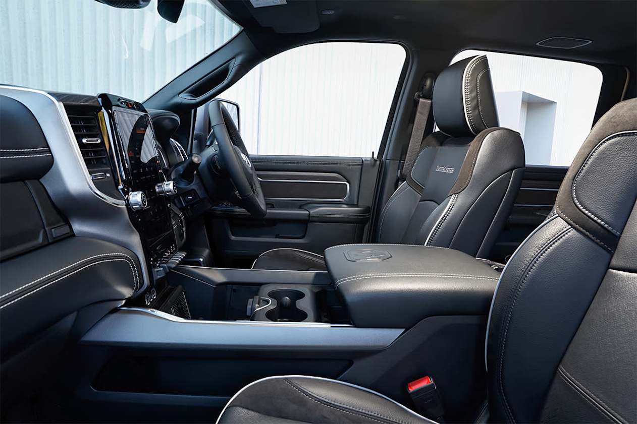 The Ram 2500 HD and 3500 HD for 2026 change from a six-seater to a five-seater full-sized ute, thanks to the switch to normal 'bucket' seats. Heated and ventilated, they are designed to provide greater comfort. In the rear, the three-person bench is now fixed, save for the storage available underneath the hinged split-fold cushion.