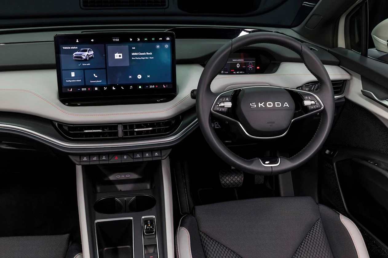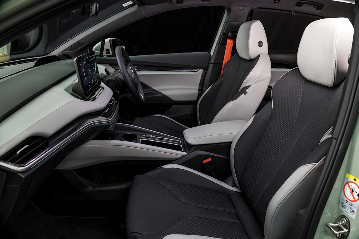 There’s a heavy emphasis on the use of what Skoda says are “sustainable, practical and durable materials” in the Elroq cabin. The ‘Loft Design’ interior in the 85 Select uses fabric comprising 78 per cent recycled PET plastic, while the ‘Lodge Design’ in the 130 Years Edition features synthetic leather and a fabric made from Nylon waste.