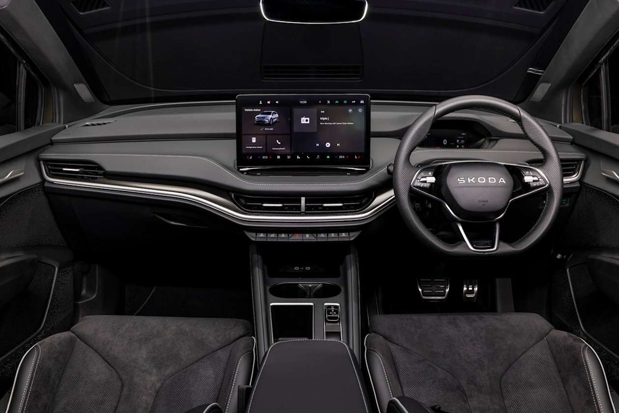 The dashboard features two electronic displays – one binnacle ahead of a driver, as well as a 13-inch touchscreen for the multimedia system. Answering to earlier criticisms of being difficult and glitchy to operate, the system found in the facelifted Enyaq Series II from 2025 onwards has easily-accessible on-screen buttons as well as several hard buttons beneath. The display features wireless Apple CarPlay and Android Auto, reverse camera and digital radio. Superb ventilation, heaps of storage and a nice ambience are further Enyaq virtues.
