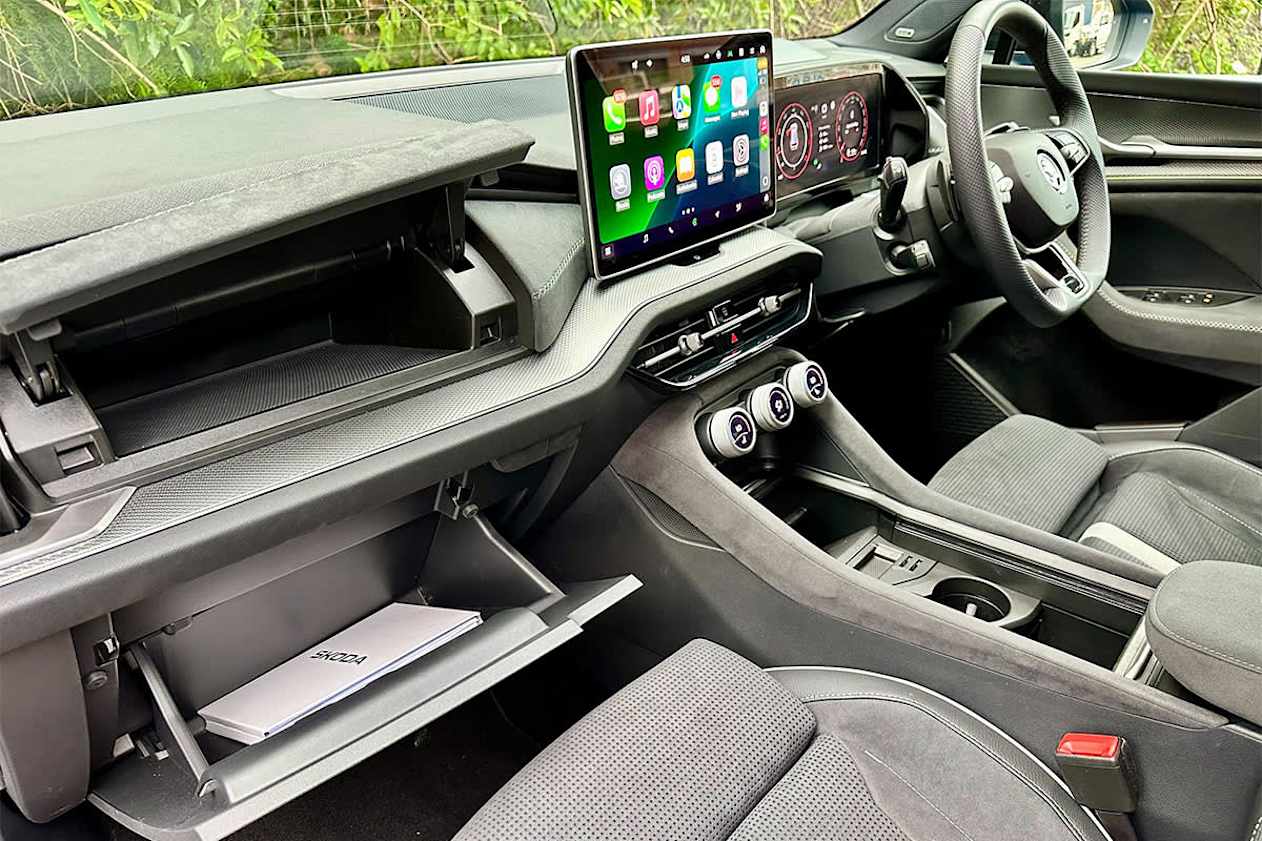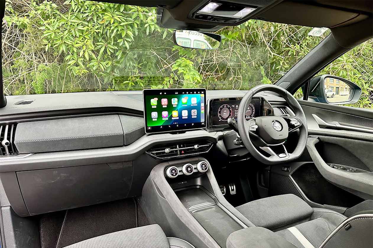 Inside, the Kodiaq uses leather-appointed or Suedia trim depending on grade, with black or cognac finishes available. A 10-inch digital cockpit and 13-inch infotainment screen are standard. Tri-zone climate control, ambient lighting and storage touches like an umbrella in the driver’s door are included.