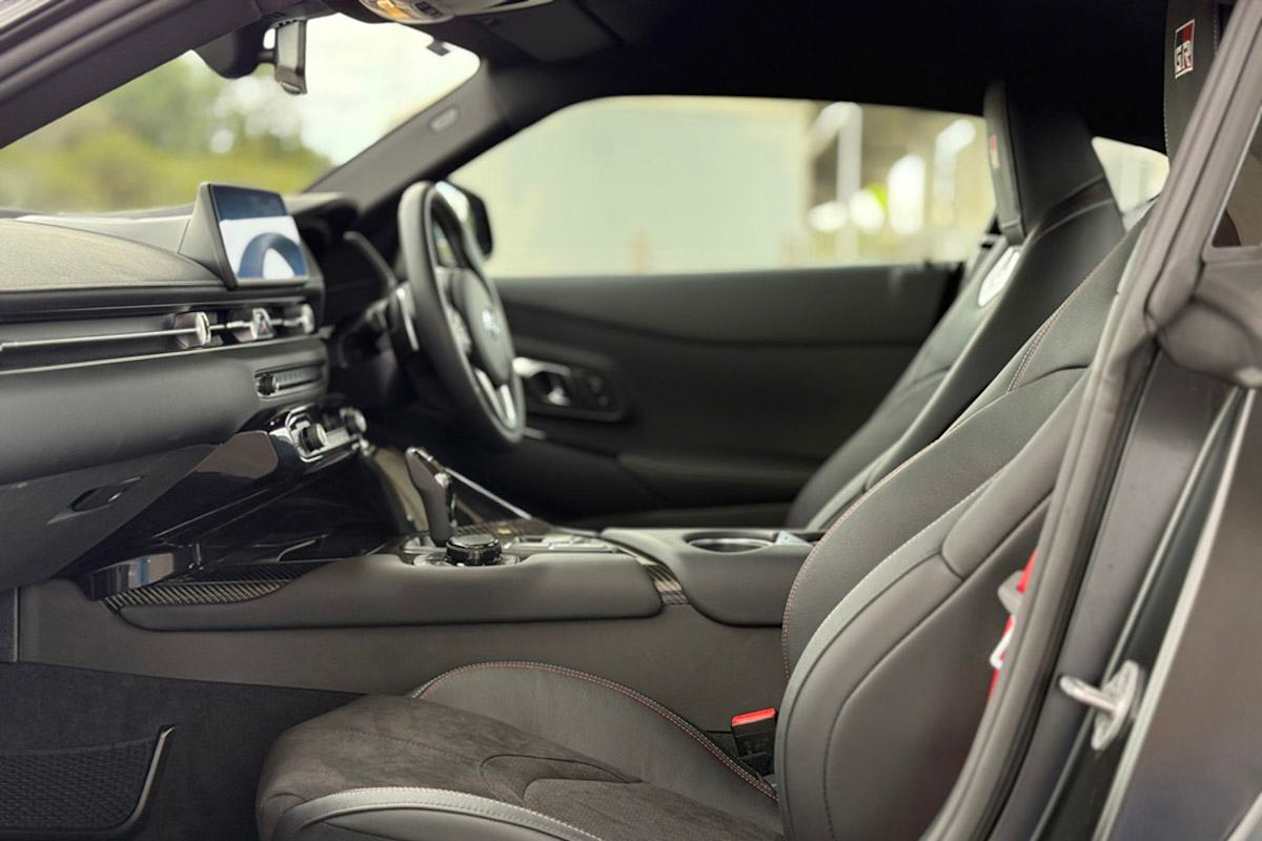 The 2026 Toyota Supra is a strict two-seater. Both GT and GTS grades come with leather-accented sports seats, offering heating and power adjustment. The Track Edition upgrades to Alcantara bucket seats with GR embroidery and red belts, designed for extra grip during high-performance driving.