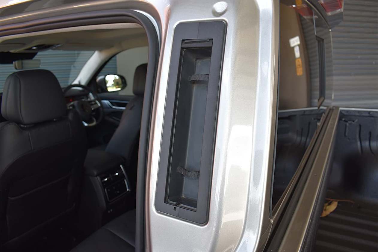 Another interesting storage idea is the slender vertical compartments located in each of the cabin’s rear roof pillars (see images). They’re hidden by the doors when closed and accessed through slide-up covers. We reckon these could store collapsible umbrellas in a most convenient location.