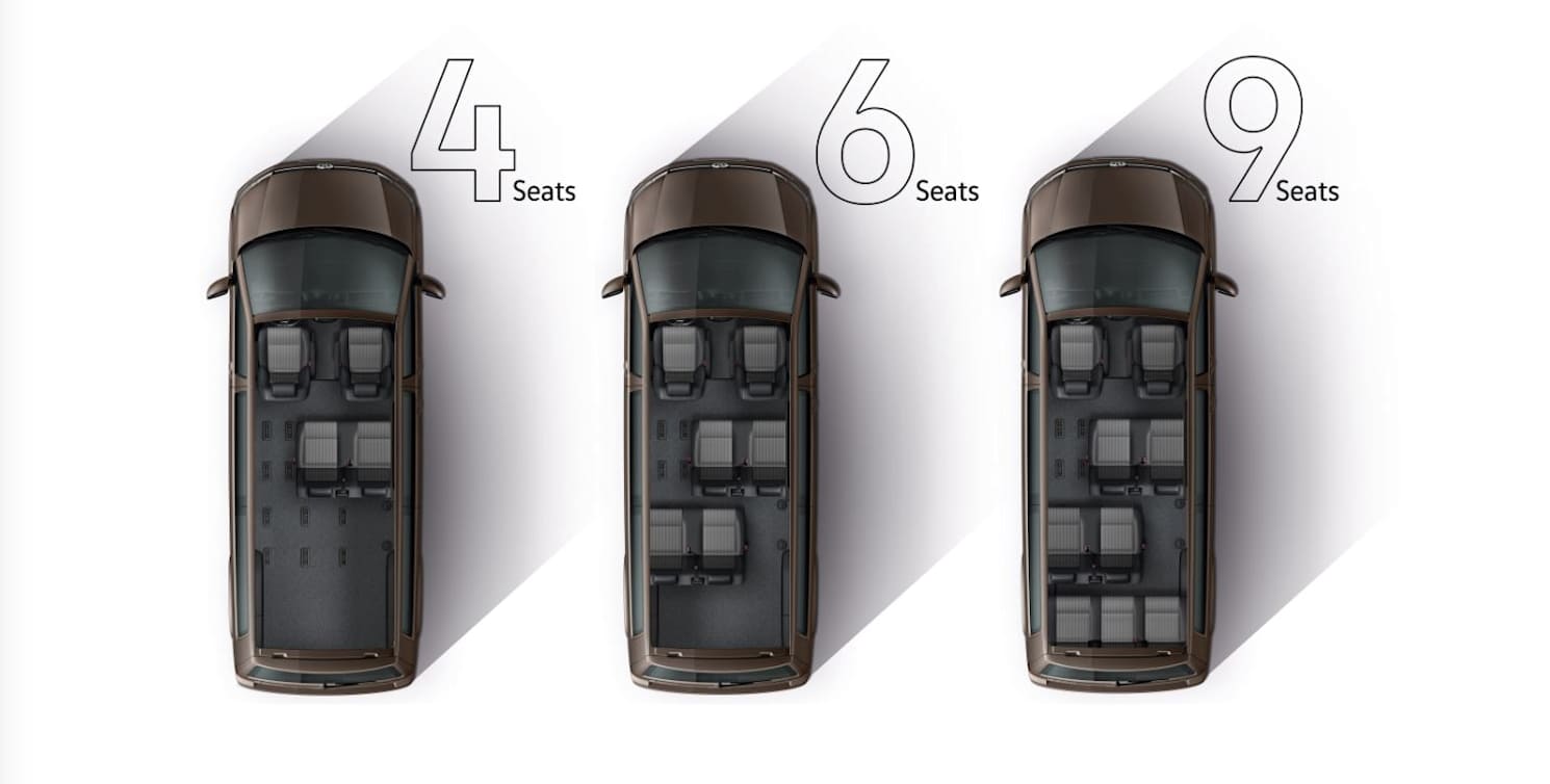 The Volkswagen Caravelle is available with up to nine seats, with various configurations. The double fold three-seater rear bench is completely removable for increased versatility. All variants come with Titanium Black cloth seat trim.