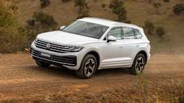 Standard accessories for the Touareg includes push-button start, keyless entry, carpet mats, LED headlights, daytime running lights, five USB-C ports, three 12-volt sockets, wired/wireless Apple CarPlay/Android Auto, wireless charging pad, Bluetooth, DAB+ radio, eight-speaker sound system, front/rear parking sensors, 360-degree view reversing camera, rain-sensing windshield wipers, auto-headlights, dual-zone air-conditioning, dust/pollen filter, ambient lighting system (30 colours), and child safety locks on rear doors and windows.