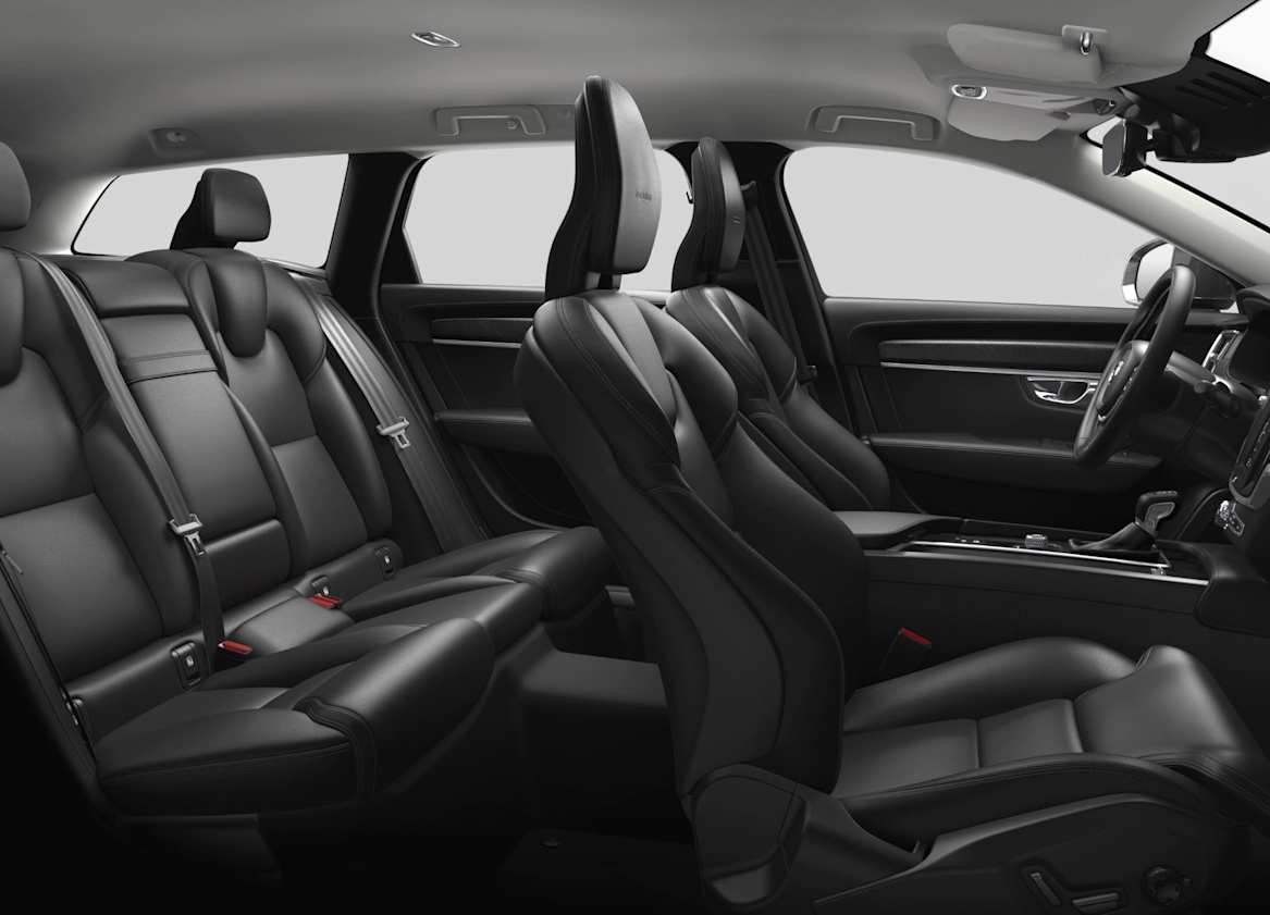 The following Volvo V90 is available with five seats. The D5 Cross Country variant comes with the choice of either Comfort seats with Fine Nappa Leather accented upholstery or Contour (sport) seats with Leather accented upholstery as standard. Contour (sport) seats are available with Fine Nappa Leather upholstery as an optional extra, as are perforated ventilated Comfort seats, also upholstered with Fine Nappa Leather. The standard Leather seats are available in the choice of Charcoal, Amber, or Blond. Nappa Leather and Perforated Nappa Leather upholstery is available in the choice of Charcoal, Amber, Brown or Blond.